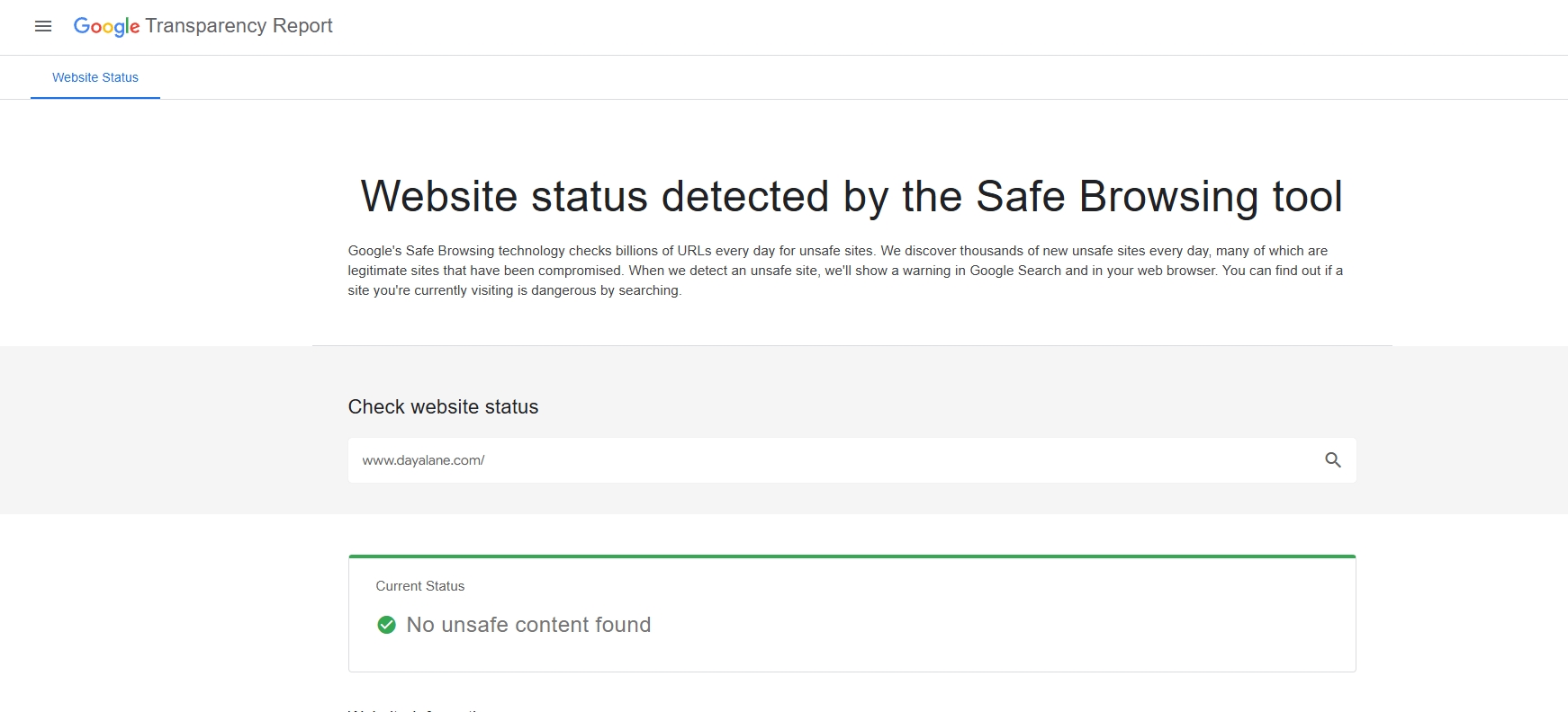 Use Google Transparency Report to check www.dayalane.com status and get the result “No unsafe content found”.