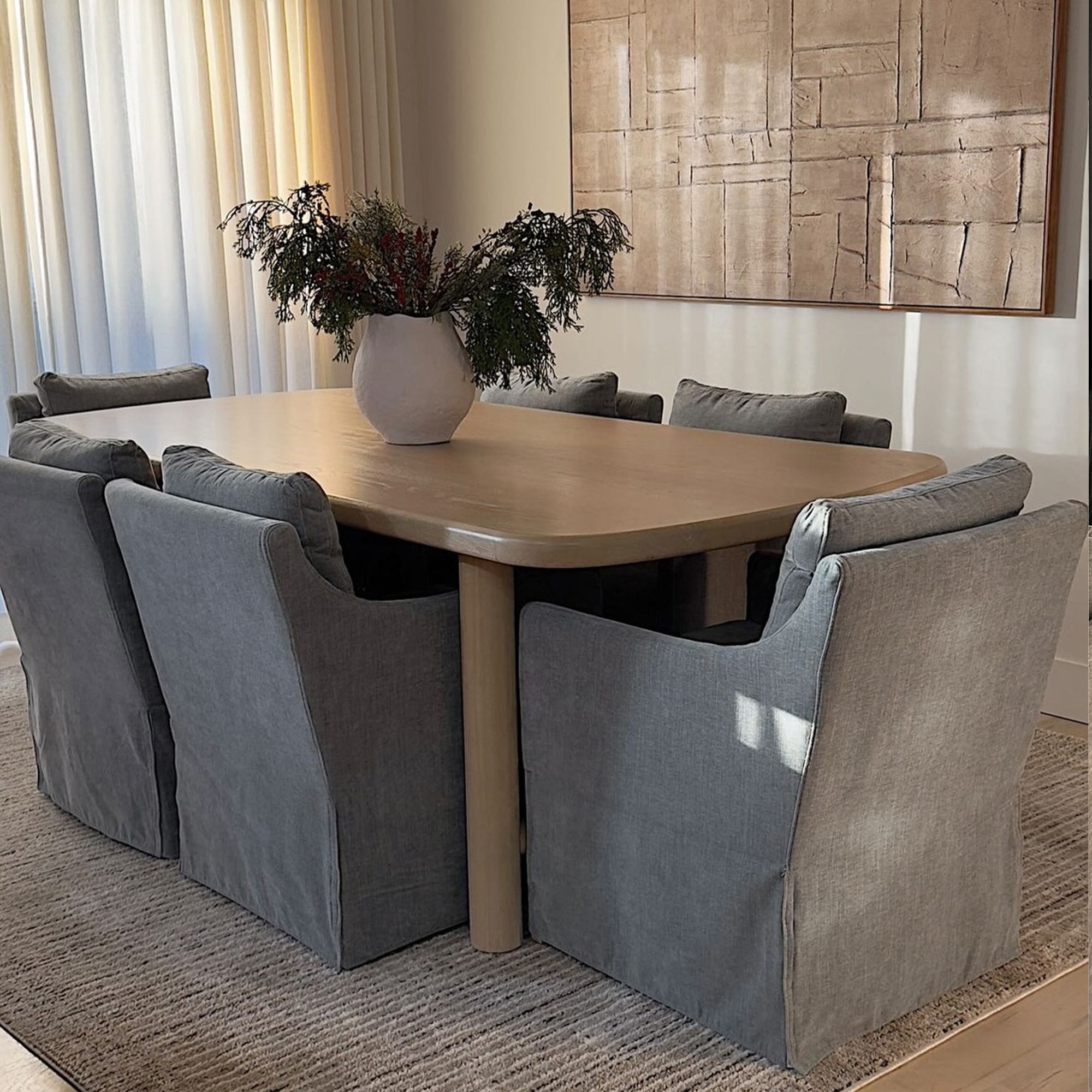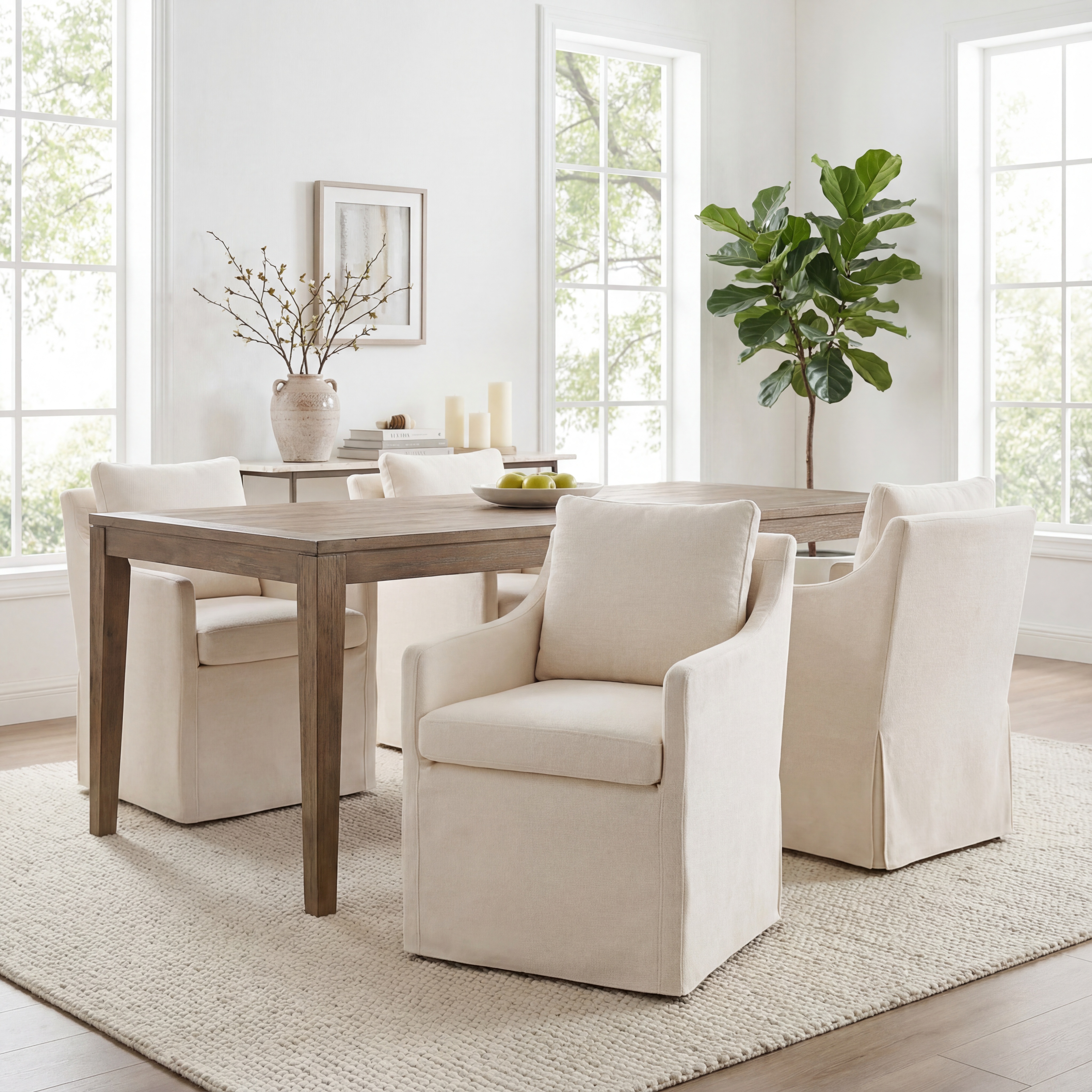 Their neutral upholstered finish and clean silhouette make them easy to match with a wide range of dining table styles, from rustic wood tables to sleek modern designs. They also work well alongside matching or mixed dining room chairs.