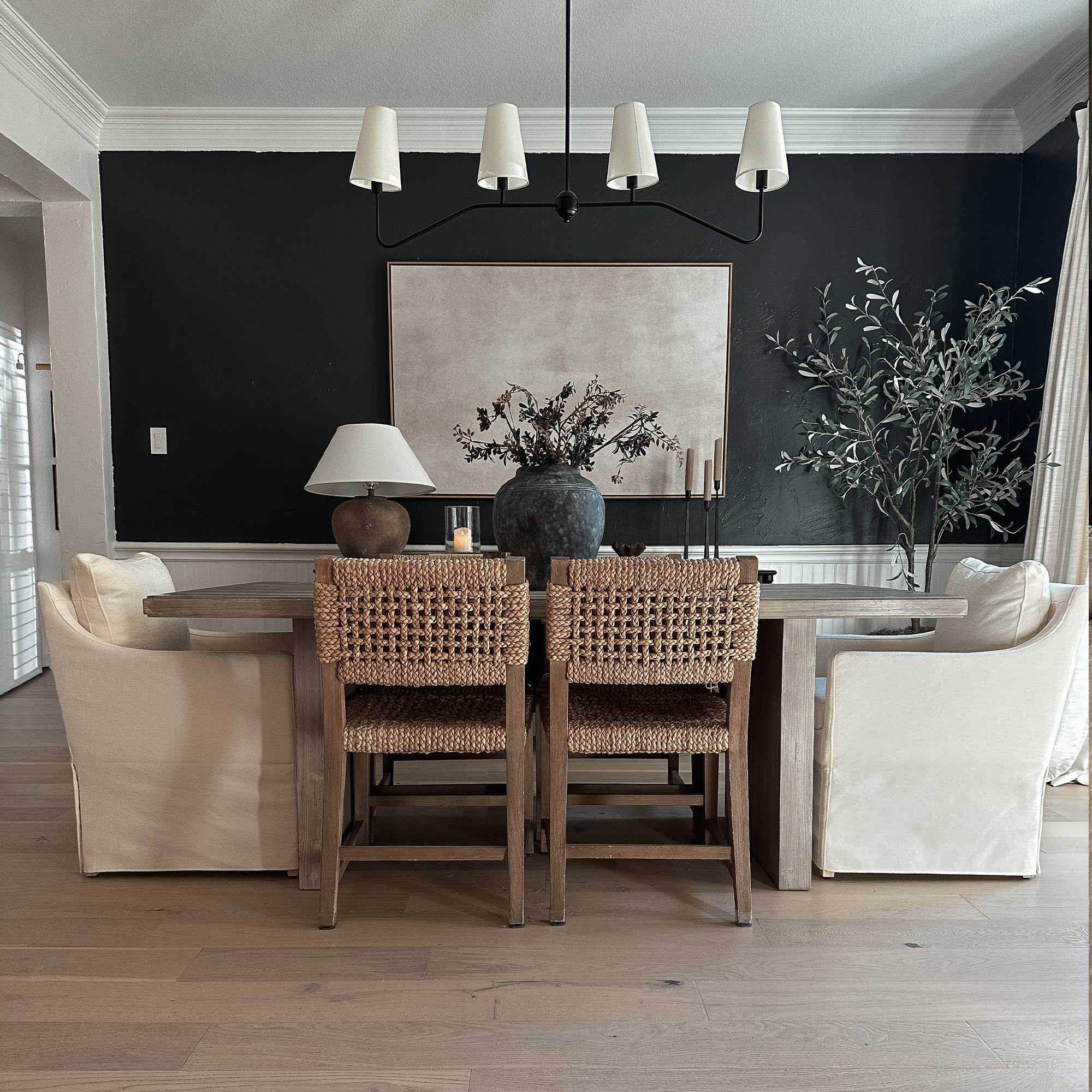 The design blends modern dining aesthetics with timeless appeal. Clean lines, upholstered detailing, and warm wood elements allow these dining chairs to complement modern, contemporary, or modern farmhouse dining room styles.
